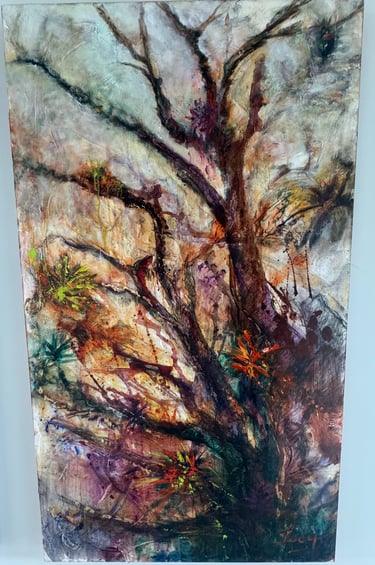 Un árbol que respira fuego interior y vida nueva entre sombras.